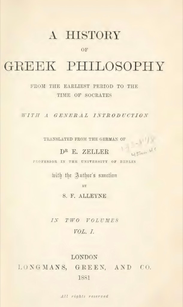 Es en esta relación entre la reflexión y la religión griega que el alemán Eduard Zeller, especialista decimonónico en el pensamiento de la antigua Grecia, encuentra la clave del origen de la filosofía helena, la cual, diferente a los textos de la antigua India que describían los detalles del ritual, la religión griega, por entender sus dioses como reflejo de su humanidad, luchadores que se debatien en sofisticados argumentos sobre su proceder, sembraban, en la fortaleza de su lírica, una actitud de búsqueda que exigía la perenne interrogación sobre los porqués y los cómos de todo lo que los rodeaba. Una profunda cavilación sobre como el carácter de un pueblo fue capaz de impulsarlo en el encuentro con su unicidad, y la esencial contribución que ese delicioso hallazgo hizo en la historia de la humanidad.